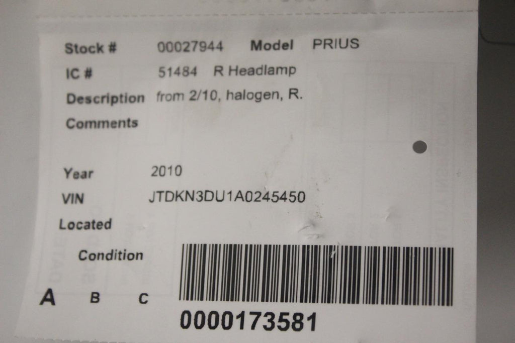 2010-2011 TOYOTA PRIUS FRONT PASSENGER RIGHT SIDE HEADLIGHT 27944