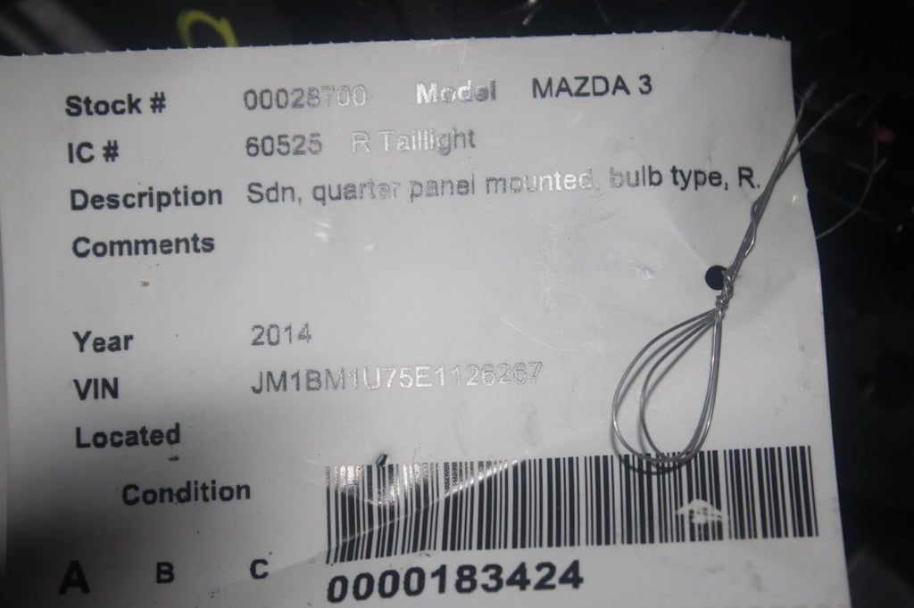 2014-2017 MAZDA 3 RIGHT PASSENGER SIDE TAIL LIGHT 28700