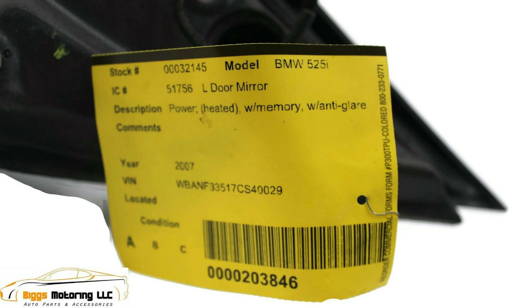 2004-2007 Bmw 525I Driver Left Side Power Door Mirror Black 32145