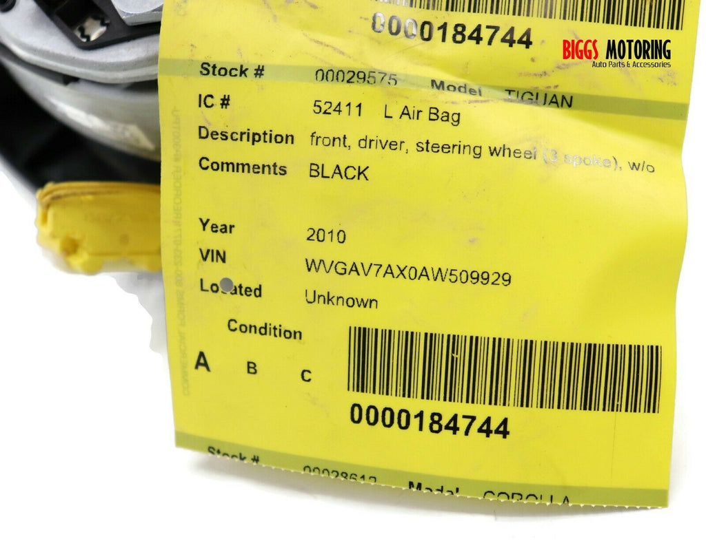 2009-2010 VW Tiguan Driver Side Steering Wheel Air Bag Black 29575