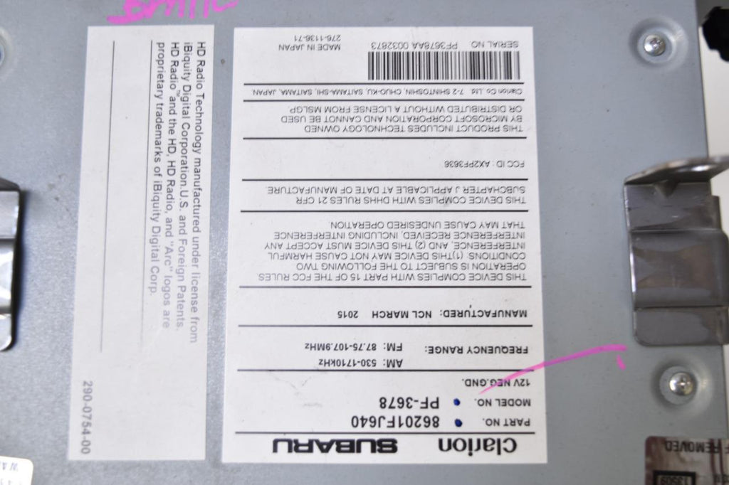 2015-2016 SUBARU IMPREZA RADIO STEREO CD PLAYER TOUCH SCREEN 86201 FJ640